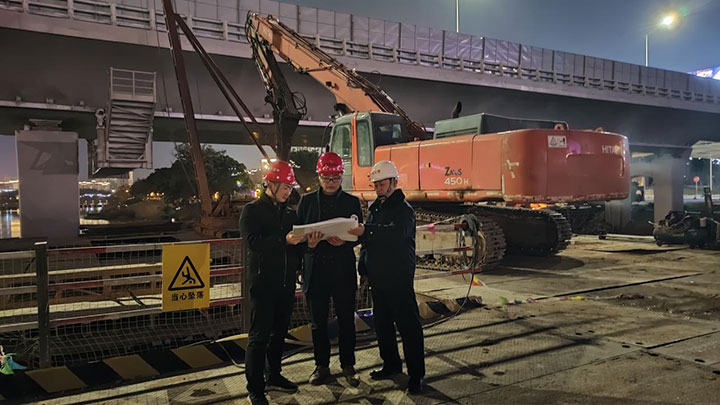 在南河大橋拓寬改造(二期)工程施工現(xiàn)場(chǎng),工程管理公司工作人員組織參建人員有序推進(jìn)水中墩鋼護(hù)筒下放定位、鋼平臺(tái)拆除、交叉口道路改造等施工作業(yè)。