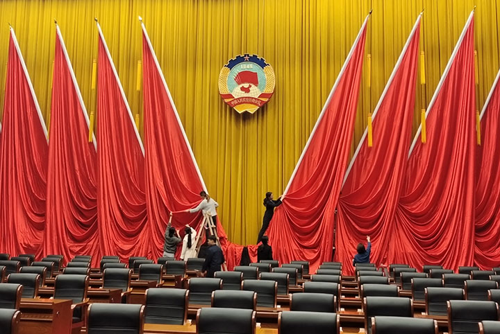 (贛州保利劇院工作人員利用周末布置主會(huì)場(chǎng))