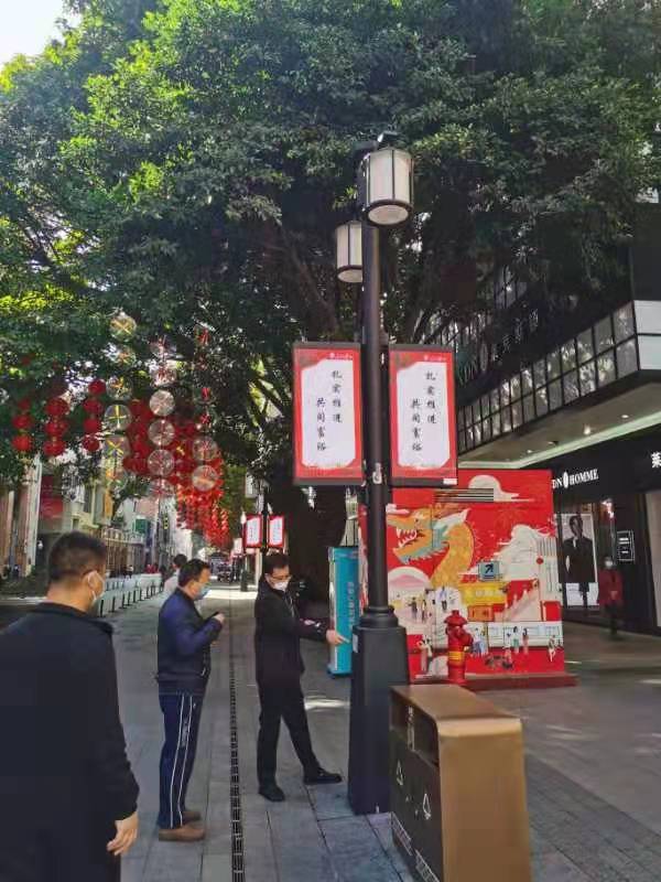 25日,考察組到廣州市北京路歷史文化街區(qū)調(diào)研由廣州無(wú)線(xiàn)電集團(tuán)旗下子公司負(fù)責(zé)建設(shè)的智慧燈桿項(xiàng)目