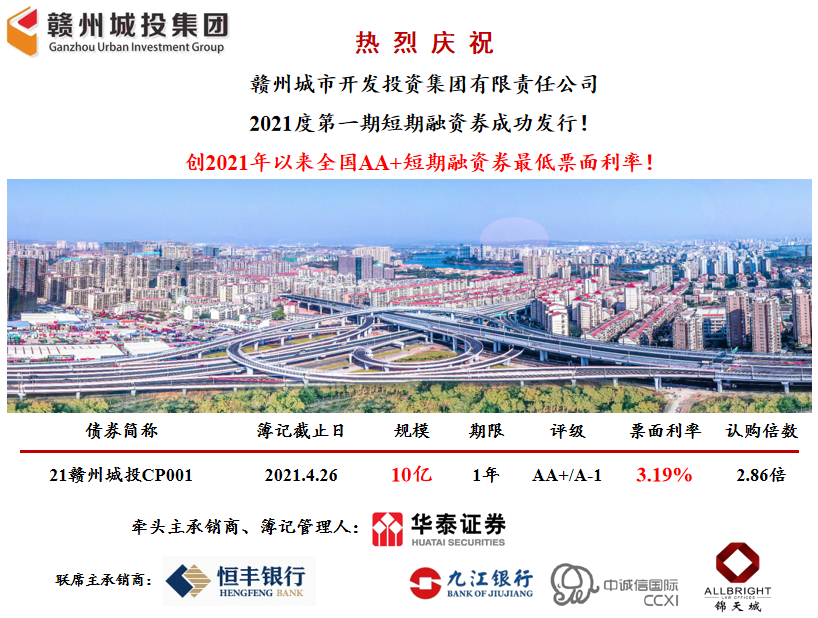 4月26日,贛州城投集團(tuán)2021年度第一期短期融資券成功發(fā)行,金額10億元,發(fā)行利率3.19%。該債券是2021年以來(lái)全國(guó)同主體評(píng)級(jí)AA+短期融資券最低利率,也是集團(tuán)戰(zhàn)略發(fā)展部黨支部黨員學(xué)黨史、悟思想、辦實(shí)事、開(kāi)新局的又一工作成效。