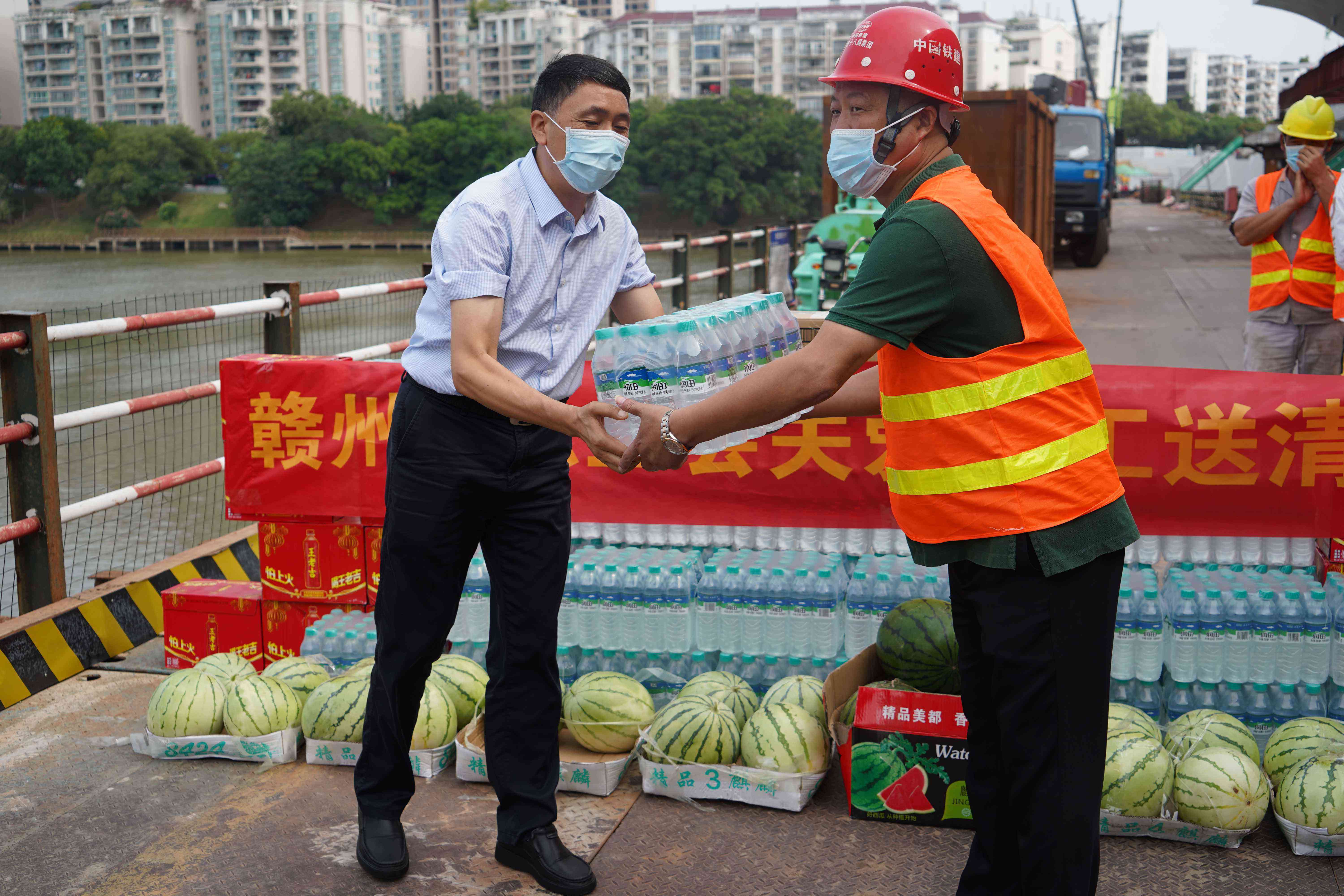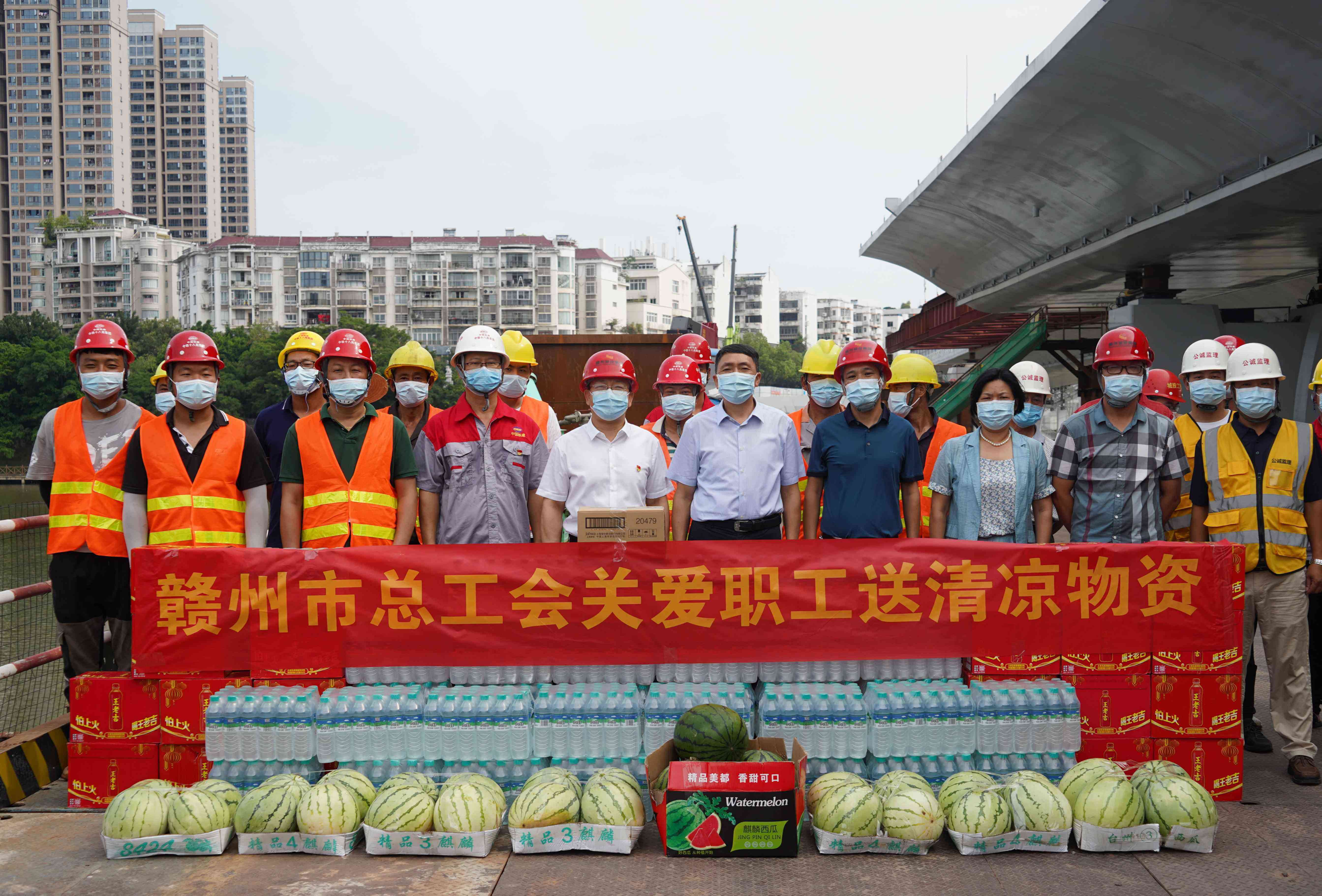 在慰問現(xiàn)場,賴定銘一行為南河大橋拓寬改造(二期)工程項(xiàng)目高溫下堅(jiān)守崗位的一線職工發(fā)放了西瓜、礦泉水、王老吉等防暑降溫物品,并與項(xiàng)目一線職工交流談心,詢問了職工積極推進(jìn)項(xiàng)目建設(shè)進(jìn)展情況,聽取了贛州城投集團(tuán)高溫津貼發(fā)放情況和落實(shí)高溫天氣作業(yè)勞動(dòng)保護(hù)的有關(guān)措施,叮囑大家要科學(xué)安排高溫期間的施工任務(wù),要堅(jiān)持勞逸結(jié)合,特別要注意身心健康和施工安全,要認(rèn)真做好項(xiàng)目工地疫情防控工作。
