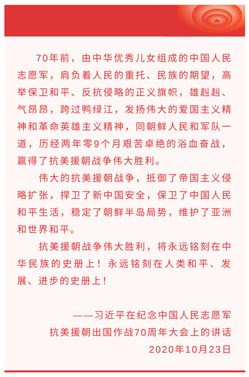 1950年10月8日,毛澤東發(fā)布命令,組建以彭德懷為司令員兼政治委員的中國人民志愿軍。19日,志愿軍雄赳赳氣昂昂跨過鴨綠江。這是以正義之師行正義之舉。中國人民志愿軍同朝鮮軍民密切配合,首戰(zhàn)兩水洞、激戰(zhàn)云山城,會戰(zhàn)清川江、鏖戰(zhàn)長津湖等,此后又構(gòu)筑起銅墻鐵壁般的縱深防御陣地,實施多次進攻戰(zhàn)役,粉碎“絞殺戰(zhàn)”、抵御“細菌戰(zhàn)”、血戰(zhàn)上甘嶺,創(chuàng)造了威武雄壯的戰(zhàn)爭偉業(yè)。